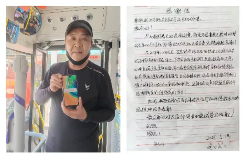 5月1日上午,孟津分公司303路公交車駕駛員郝紅樸在車廂里撿到一部手機,正要上報經(jīng)營科時,剛巧失主女兒打來電話。得知失主正因丟失手機著急上火時,郝紅樸急忙進行安慰,并表示待車輛返程時親自把手機送過去。收到手機后,失主女兒特意手寫一封感謝信送到孟津分公司調(diào)度室,稱贊郝紅樸拾金不昧的高尚品格,還為在節(jié)日期間還堅守崗位的他點贊。